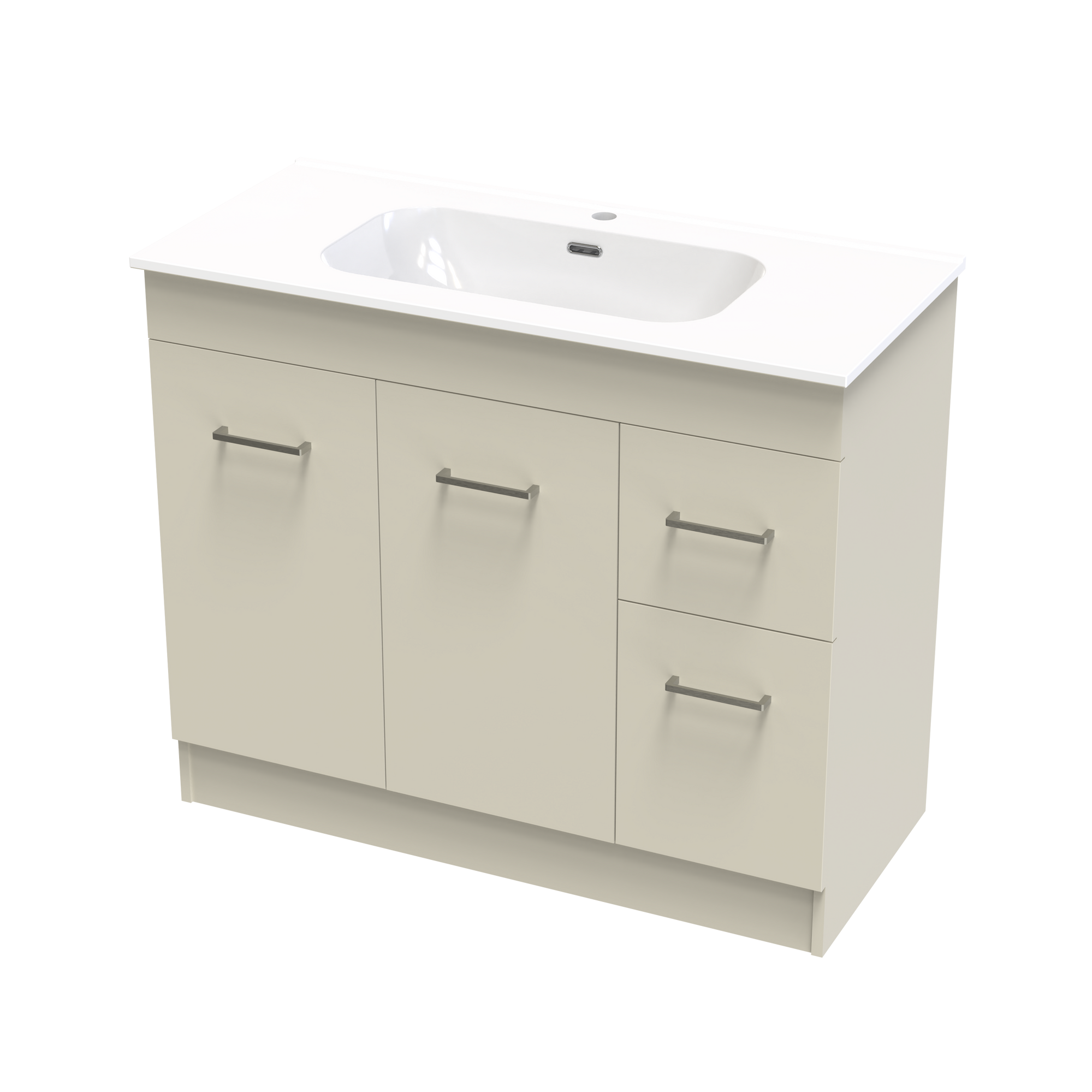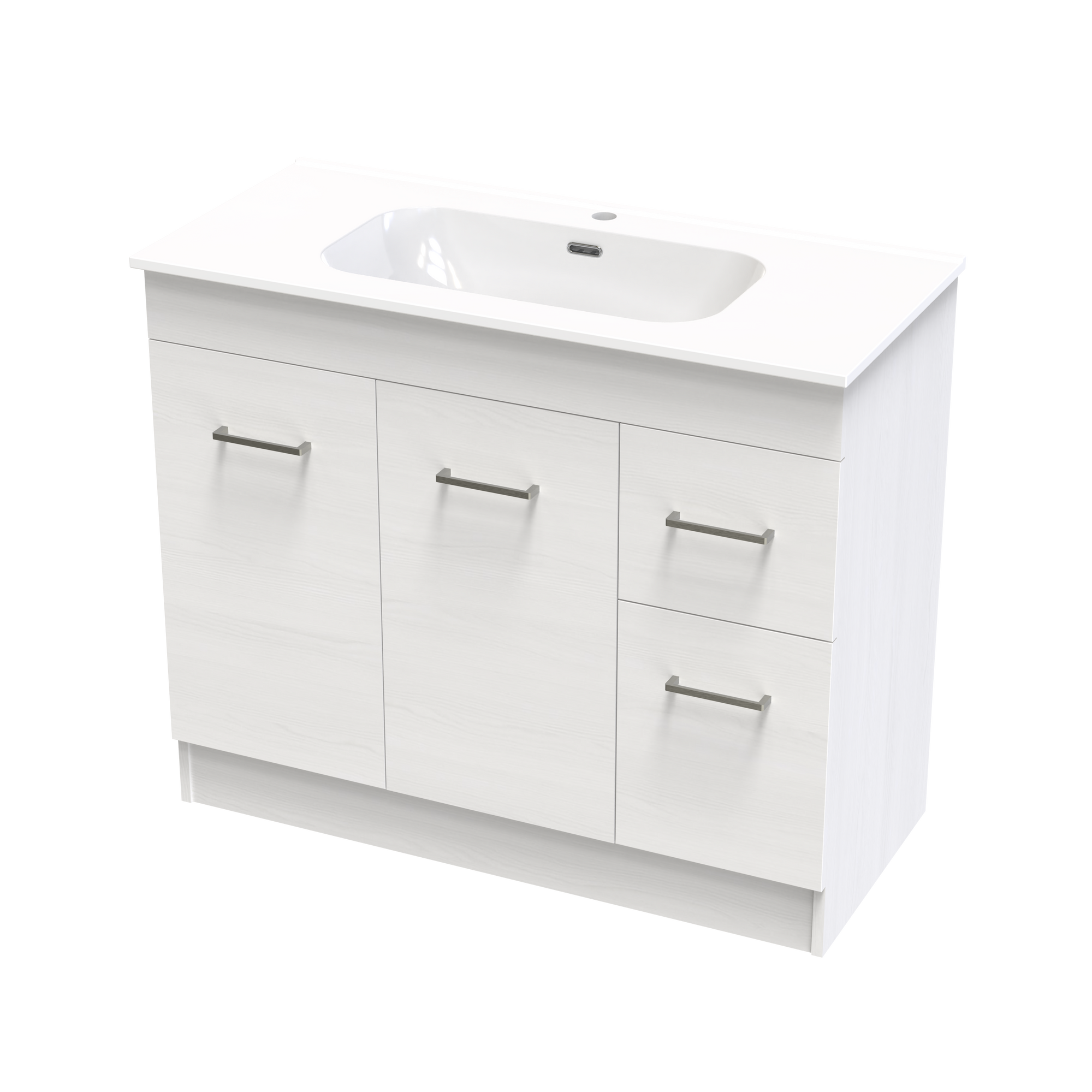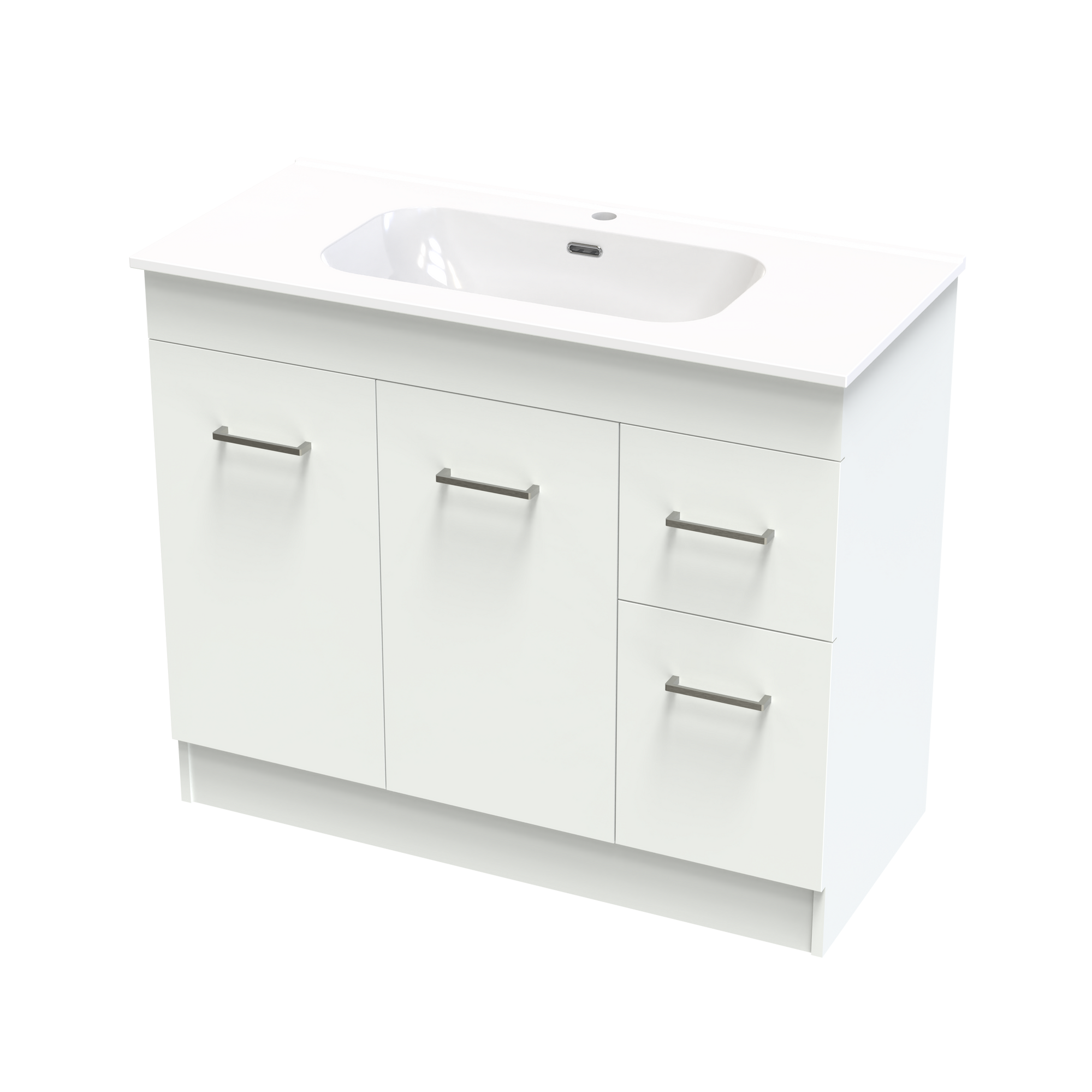 The Classic Aura 1000mm Floor Standing Vanity features a vitreous china top that is timeless and long lasting. A generous bowl and smooth curves with integrated overflow. A cabinet with classic style and functionality offering both doors and drawers for the best of both storage options. Fitted with high quality brushed nickel handles as standard with options to upgrade to black or gunmetal. A classic yet timeless design to fit any bathrooms needs. Cabinet made in New Zealand