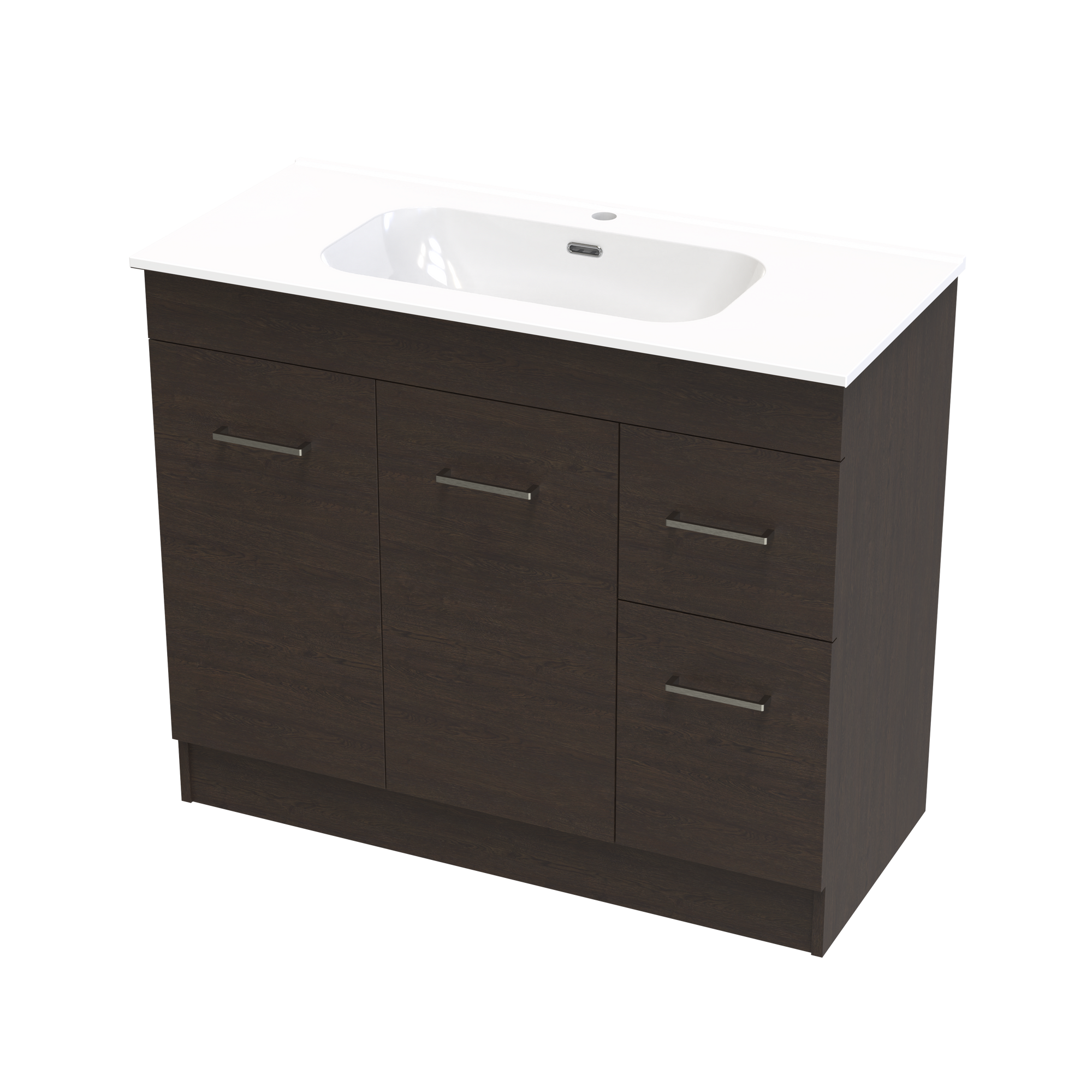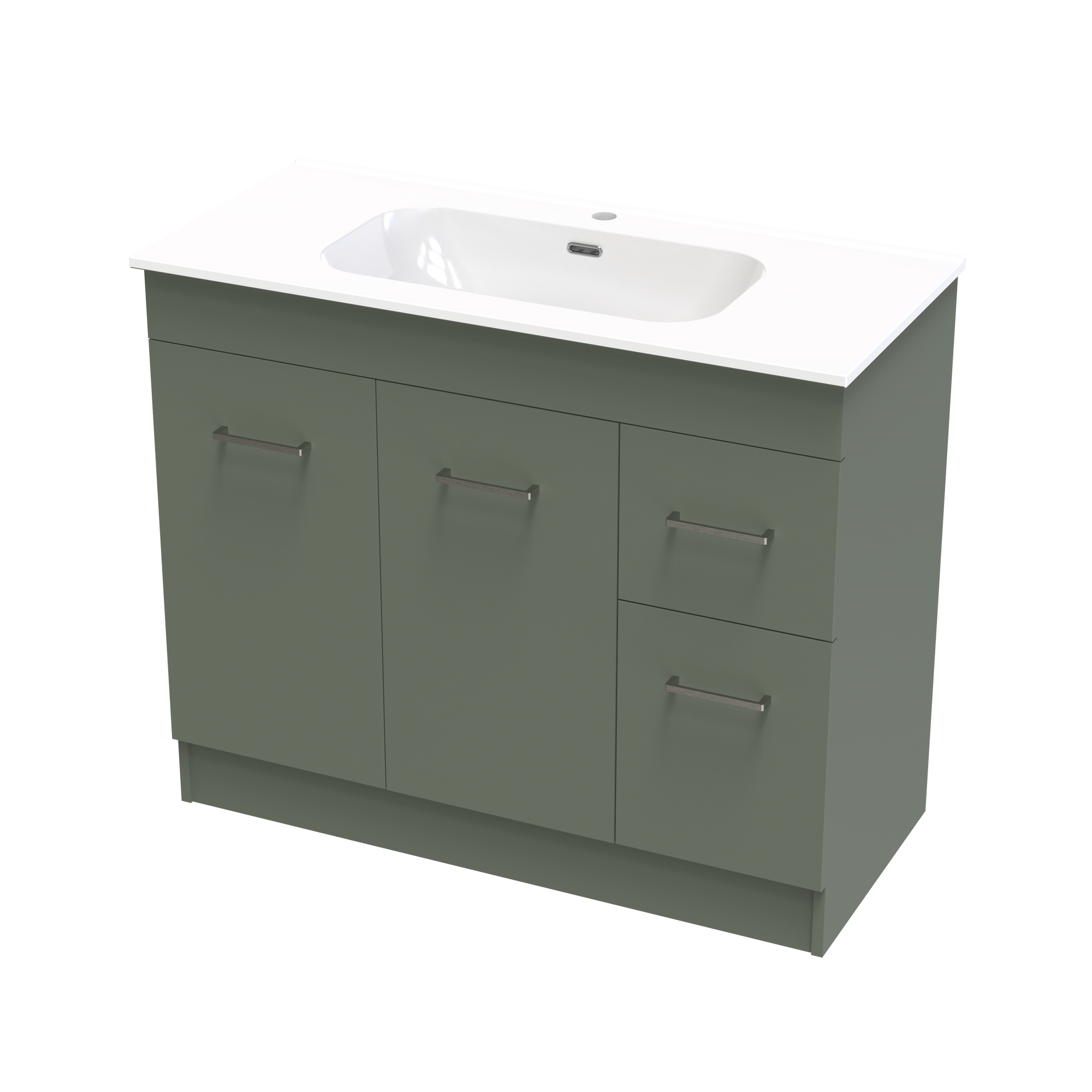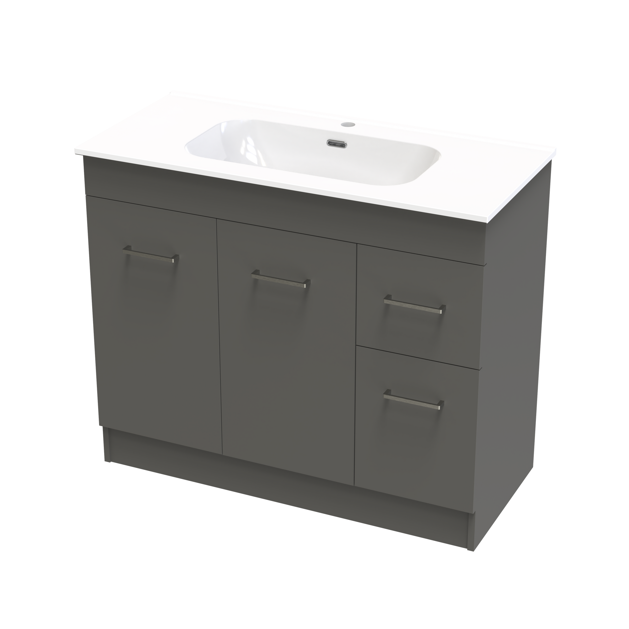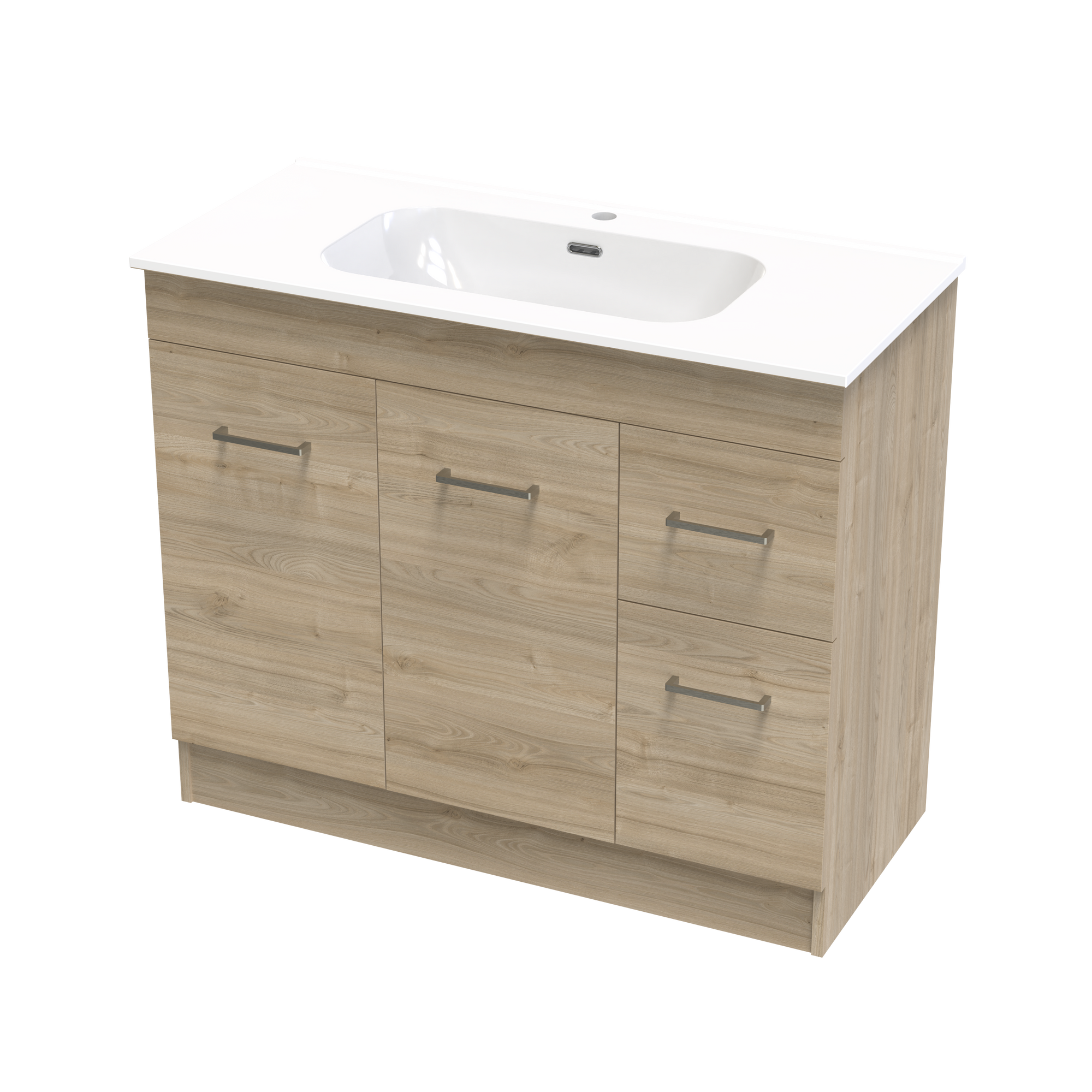 The Classic Aura 1000mm Floor Standing Vanity features a vitreous china top that is timeless and long lasting. A generous bowl and smooth curves with integrated overflow. A cabinet with classic style and functionality offering both doors and drawers for the best of both storage options. Fitted with high quality brushed nickel handles as standard with options to upgrade to black or gunmetal. A classic yet timeless design to fit any bathrooms needs. Cabinet made in New Zealand